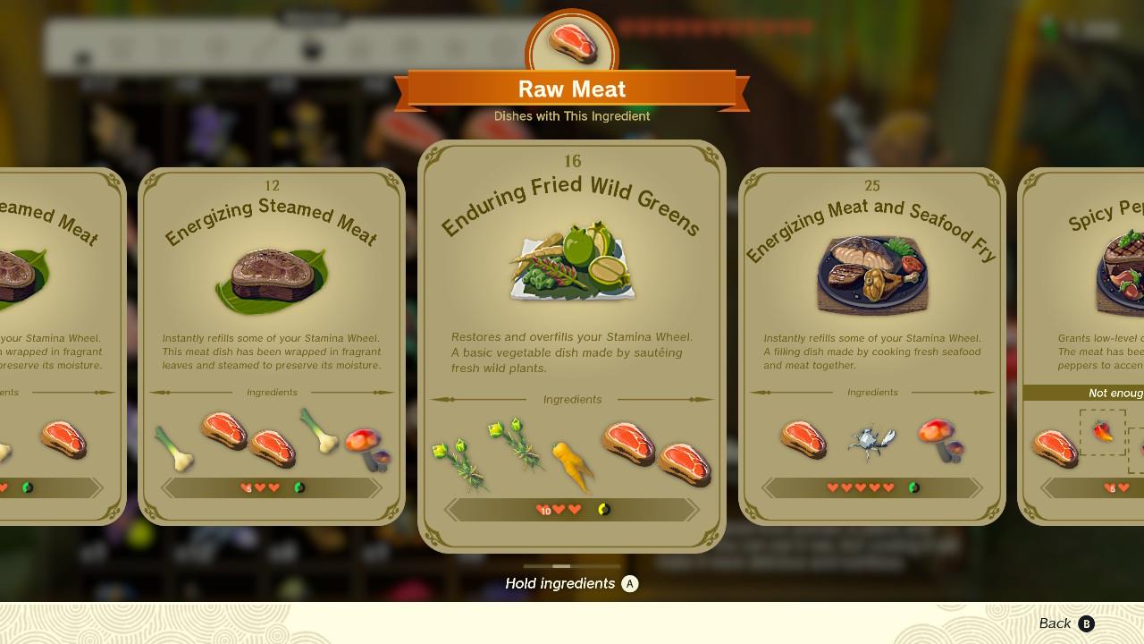 That being said, this enduring fried wild greens will replenish a ton of hearts, while also temporarily increasing your maximum stamina. I used two raw meat, two hylian herbs, and an endura carrot. With this, you’ll recover 12 hearts, and gain almost half of an extra stamina wheel, which will deplete once it’s consumed.