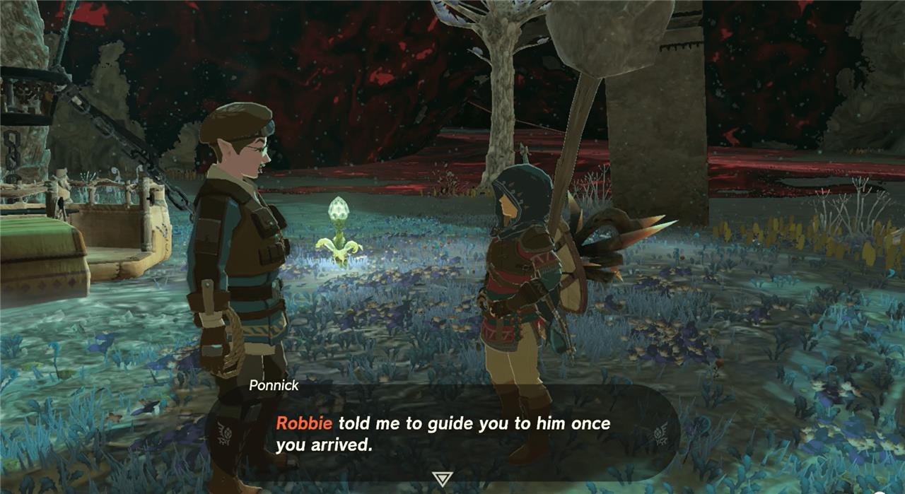 There’s a small camp at the base of the chasm. A person is standing near the fire. His name is Ponnick, from the Zonai survey team. Talk to him, and he’ll tell you that Robbie went ahead. Follow his tracks to find him. First, head over to the Sisoij Lightroot, the glowing area Ponnick pointed to earlier. There’s a small fire and note beside it.