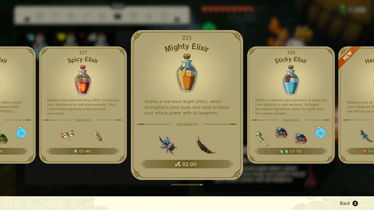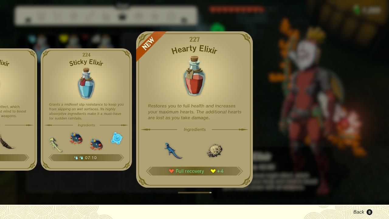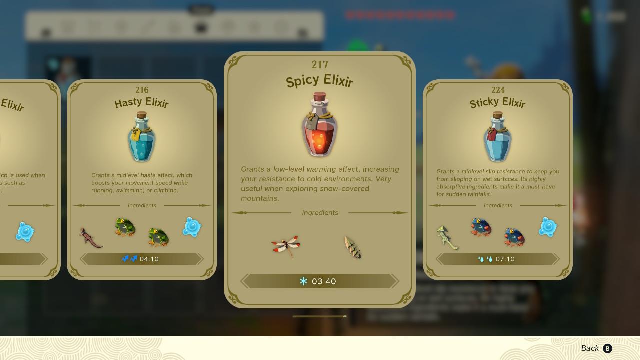 If you’re yet to obtain the Froggy Armor set, or you prefer to use a different set altogether, the sticky elixir is for you. As the name indicates, it’ll be harder for Link to slip from wet surfaces during climbing – if there’s rain or he recently took a swim somewhere, the elixir will help.