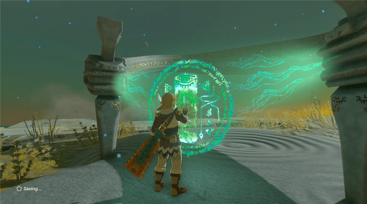 The quest begins at the empty Ganos Shrine frame, located at approximately (-3370, 0467, 1695). Reach this sky island by launching from Gerudo Highlands Skyview Tower and gliding north through the North Gerudo Sky Archipelago (low-gravity zone), using Zonai Rockets on shields for extra height, or by island-hopping from nearby spots like Starview Island.โ