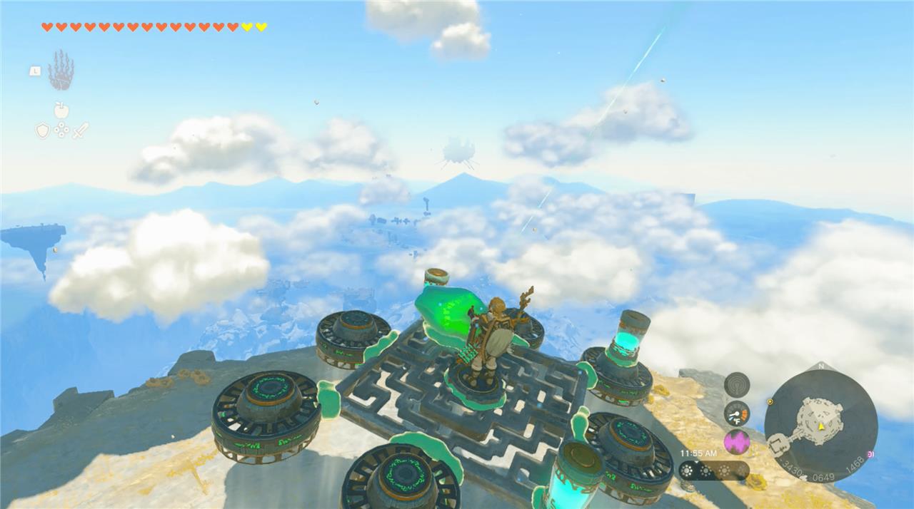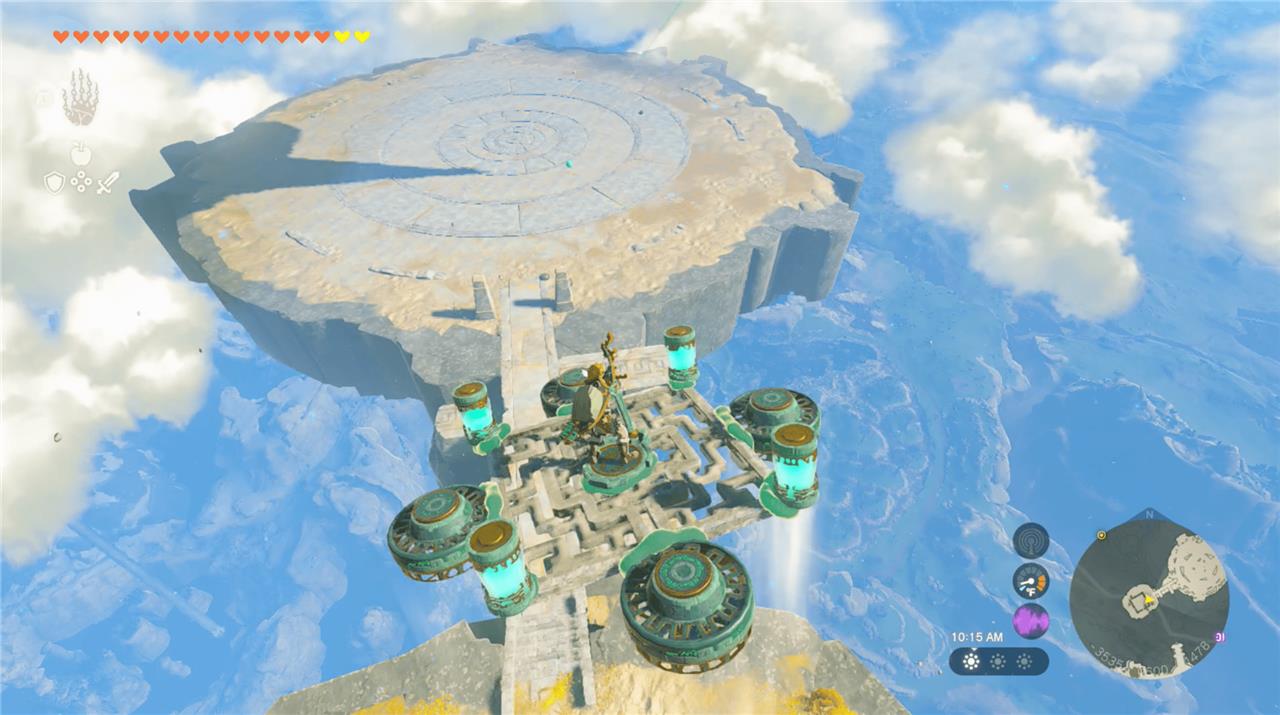 Use the Skyview Tower at coordinates around (-4664, -2507, 0496) to catapult high into the sky, then head north toward the large black sphere marking the North Gerudo Sky Archipelago, where reduced gravity extends your glide distance. Collect Zonai Rockets from nearby Like Soldiers on floating platforms, attach one or two to your shield (facing upward), and activate by surfing while holding the guard button to gain extra altitude for crossing gaps.โ