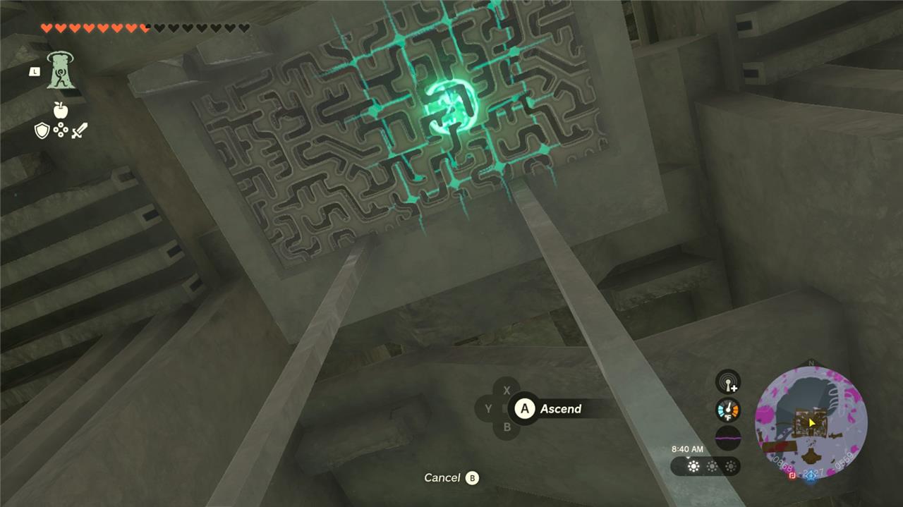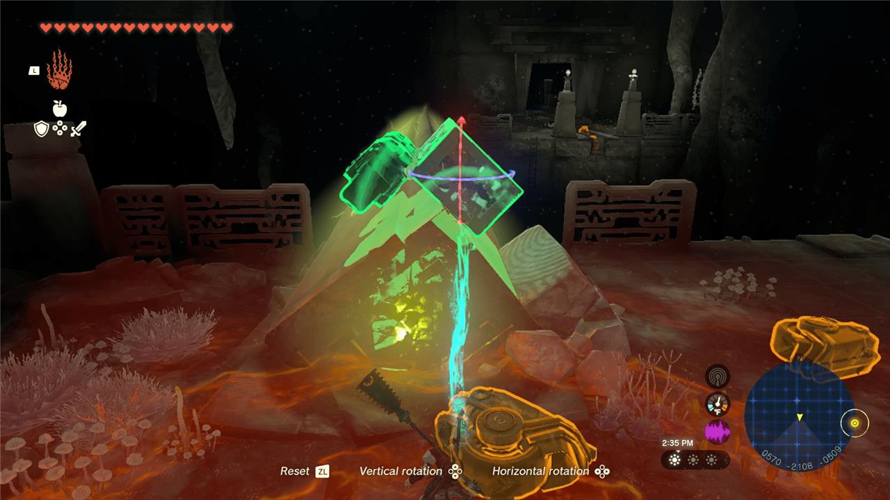 Once your box is up on the ledge, don’t leave the area quite yet. Face east to see some lasers blocking off an area with Zonaite and a chest opposite of the exit. Take the rocket elevator next to the lasers up and use Ultrahand to bring the loot down through the grate. You’ll get a handful of Zonaite and a Large Zonaite for your troubles.
