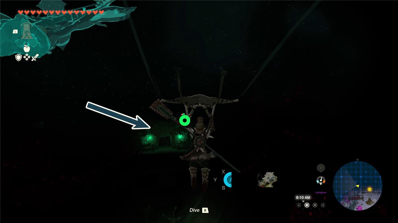 Glide down from the ruins and run up the skeleton leading to the lightroot in the north. Activate Uisihcoj Lightroot to immediately gain a bunch more visibility in the area. From here, head northeast, part the gloom-covered Aerocuda, Bokoblins, and Little Frox, so you can jump off the broken bridges into this cavern.