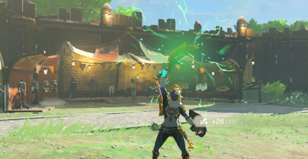 Jochi-ihiga Shrine is a Rauru’s Blessing shrine, which means the puzzles are actually outside of the shrine itself. You’ll need to first find the green crystal and then move it to the shrine location to open it up. Head over to Tarrey Town‘s left side and you’ll see the crystal: There’s a guy standing next to it, and it’s hard to miss!