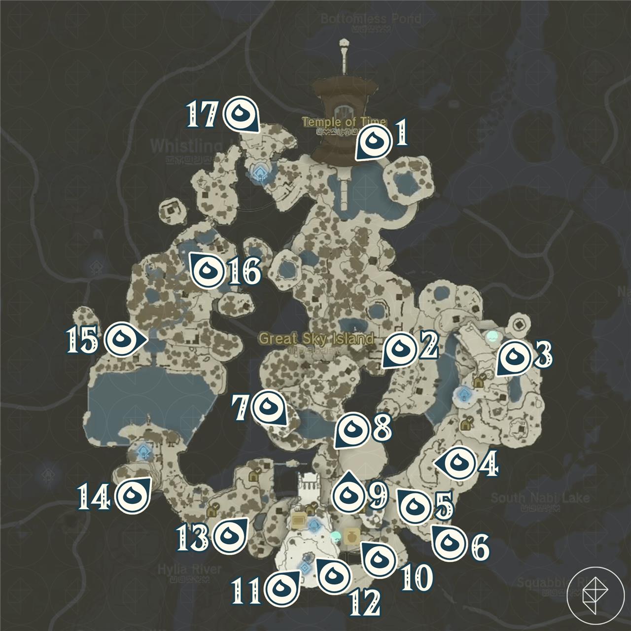 For these Korok seeds, we’ll be traversing through the Great Sky Island clockwise. You should first complete the entire tutorial before trying to scour Korok seeds. Here’s a map of Korok seeds on Great Sky Island: