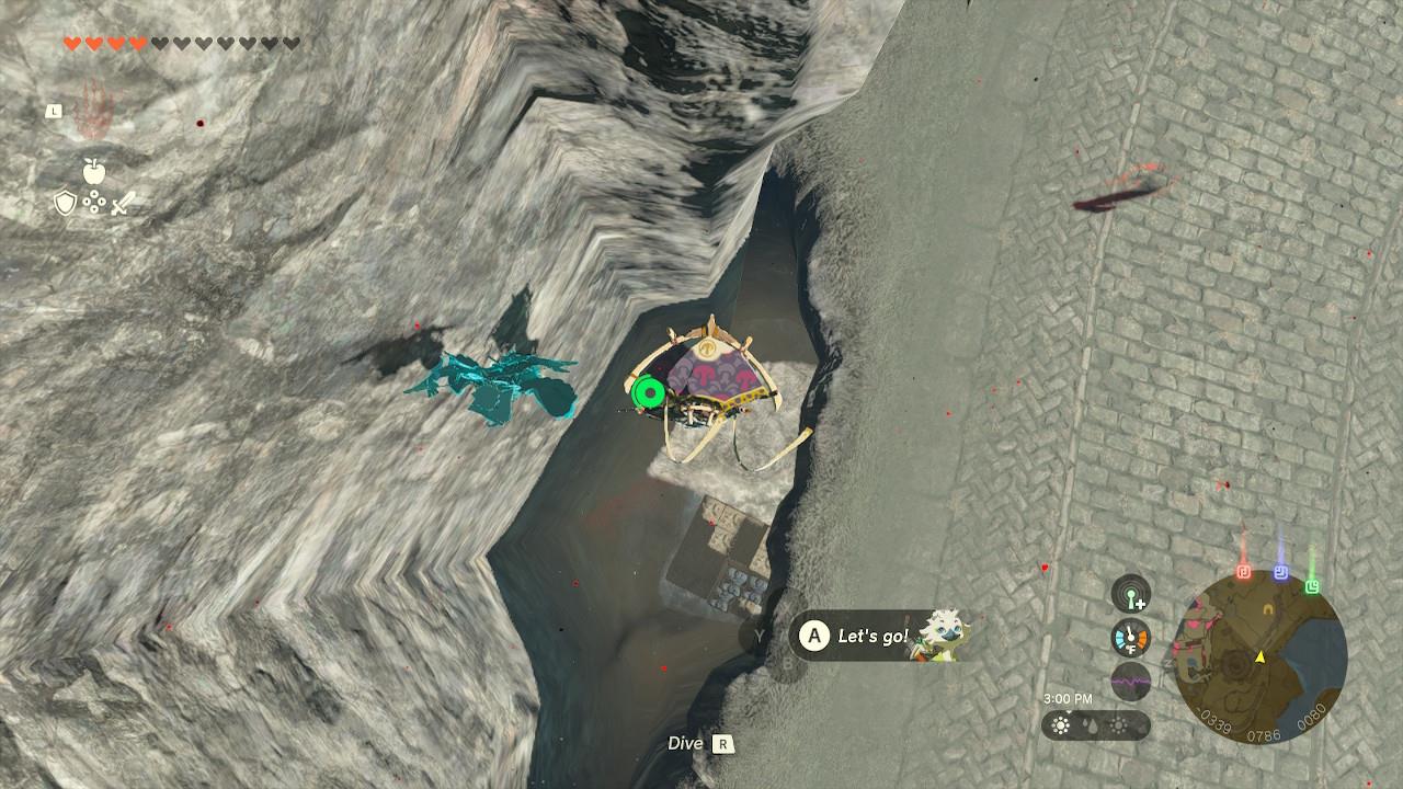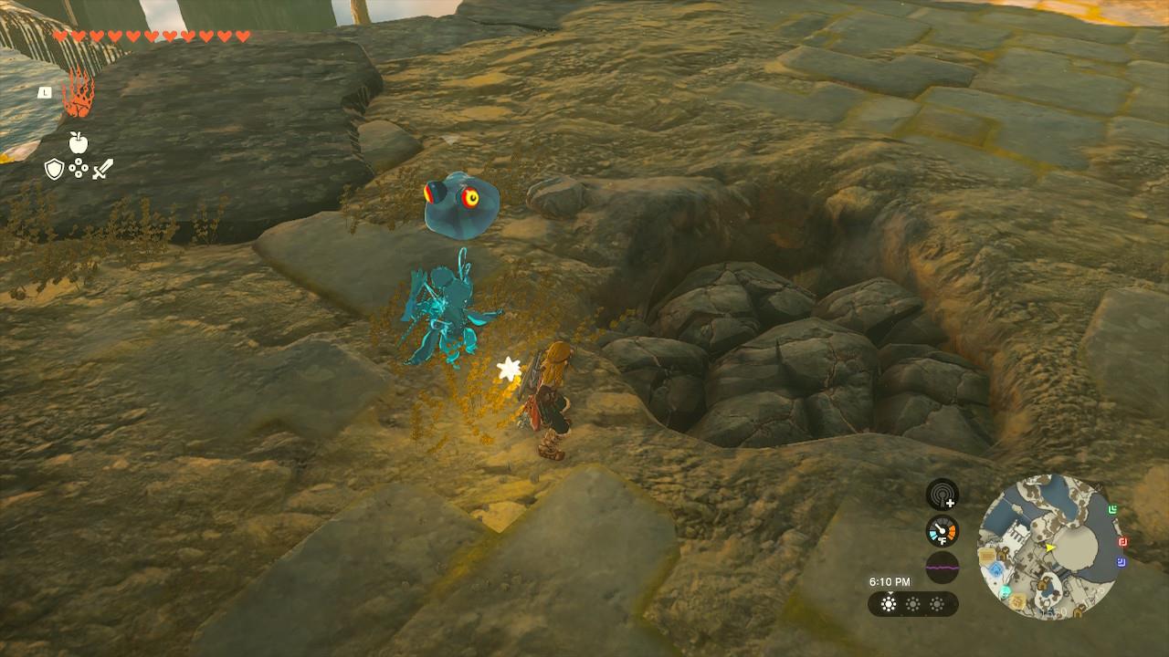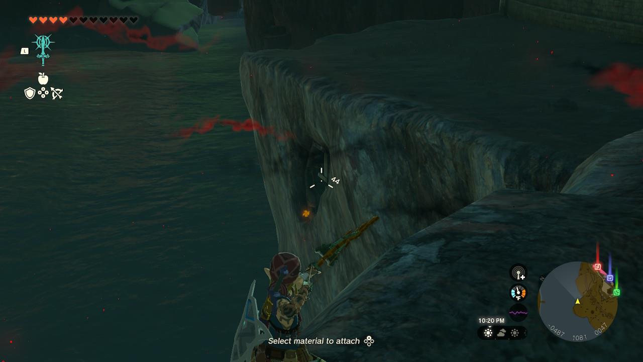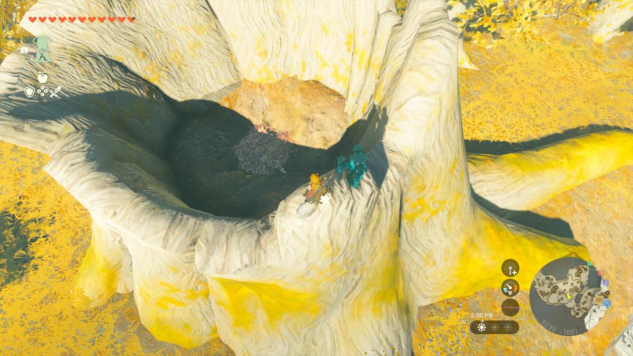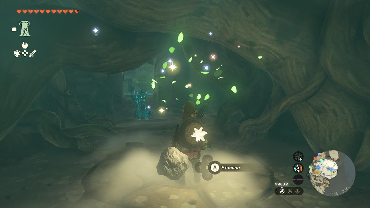 - Northeast of the Nachoyah Shrine, there’s a large, circle-shaped plateau. Head underneath it (you can follow the mine cart rails for reference) and, once at that lower ground, look for a hole that’s covered with rocks at the coordinates (0446, -1545, 1375). If you haven’t tackled the construct group nearby, it’s right next to them, up the staircase. Break the rocks (there’s a rock nearby that you can fuse to a weapon), and once down below, shoot the floating balloon on the northern end after the ledge to get the seed.