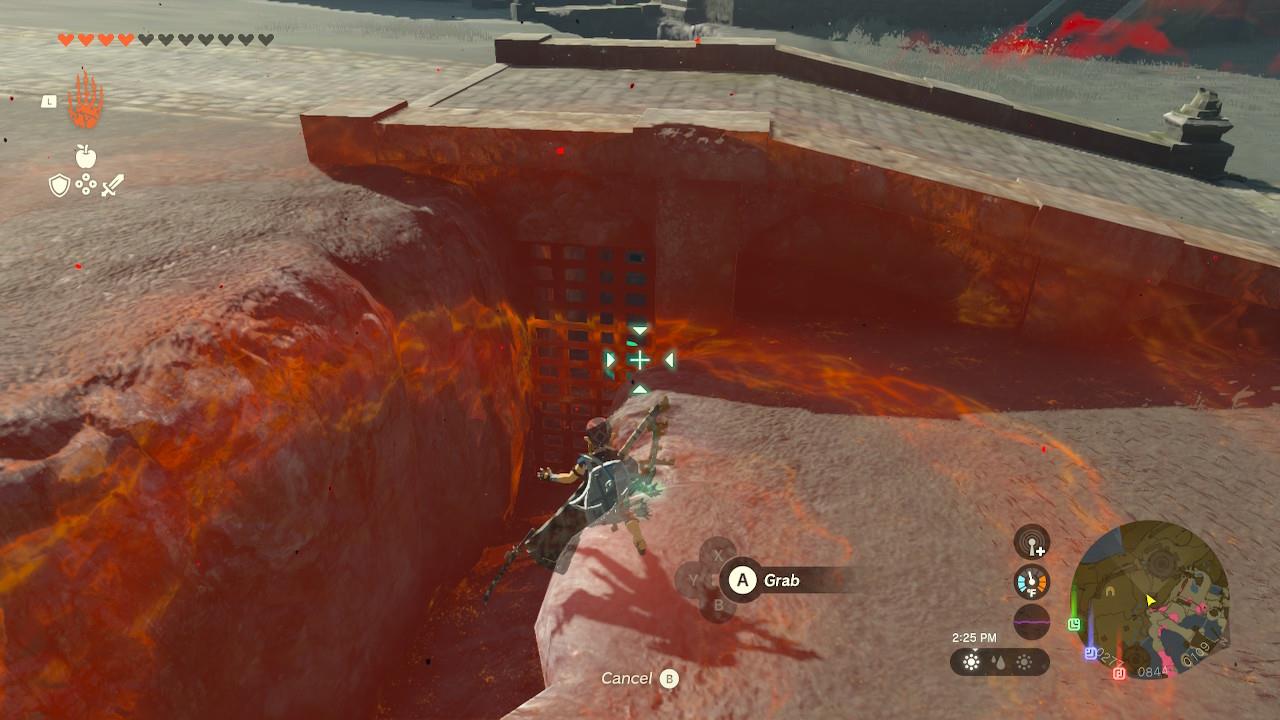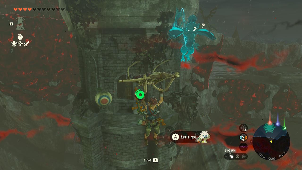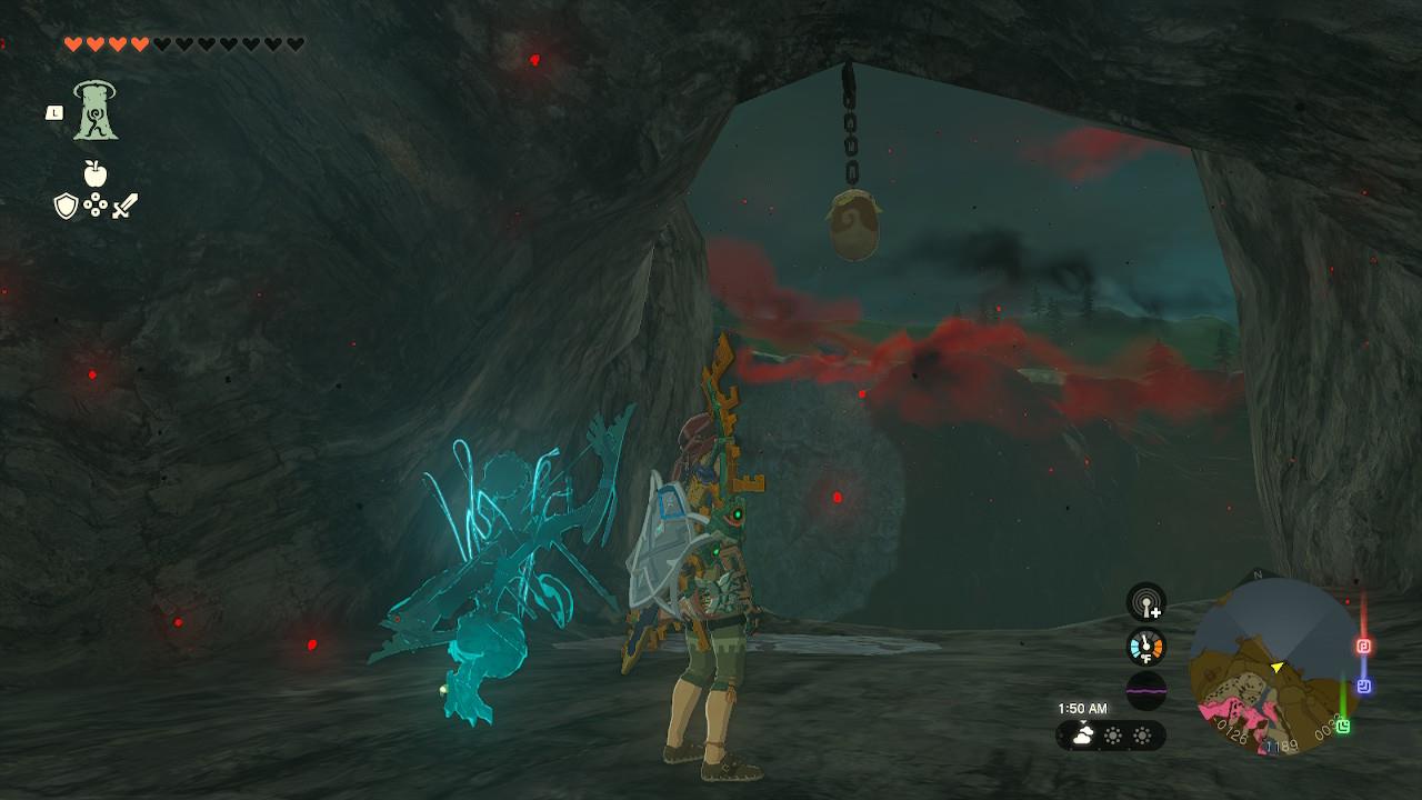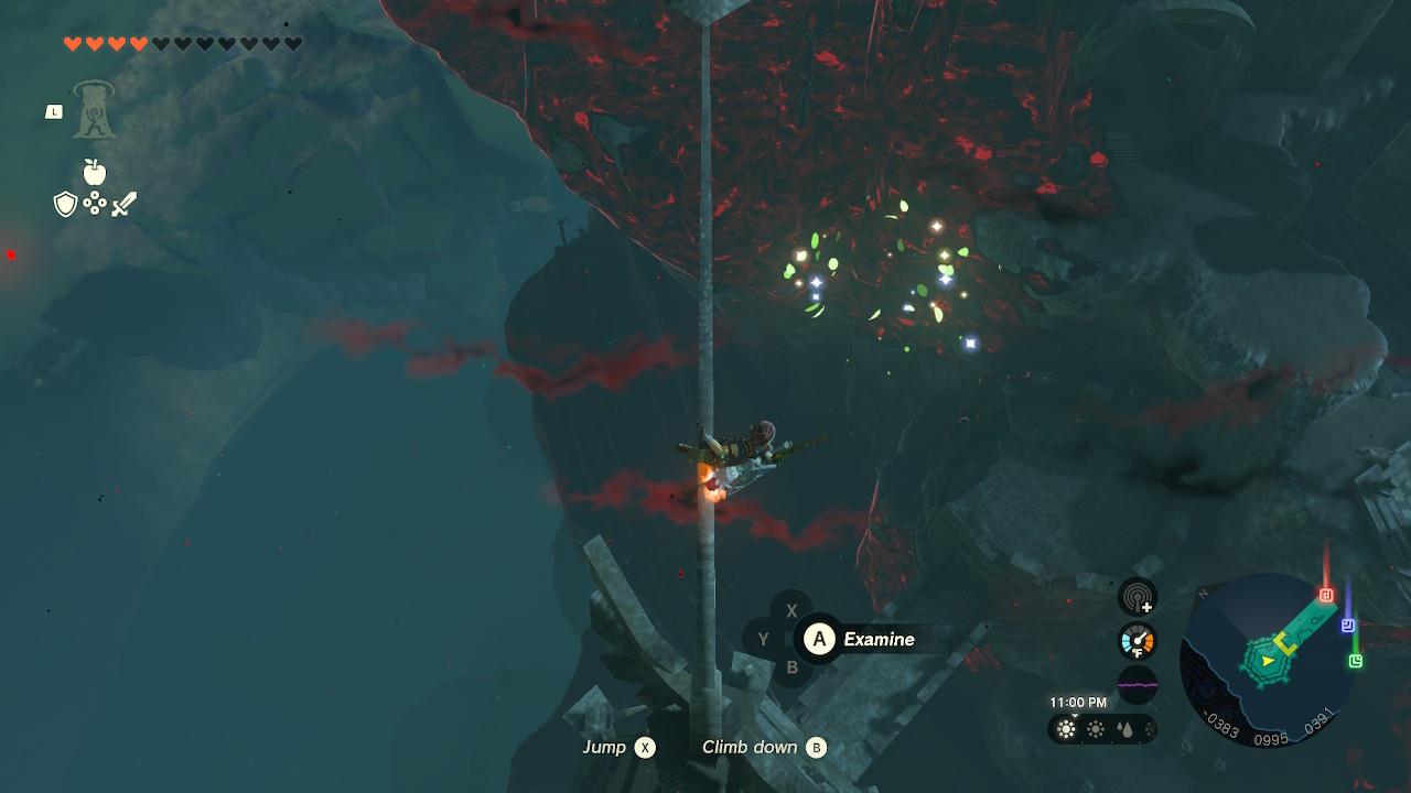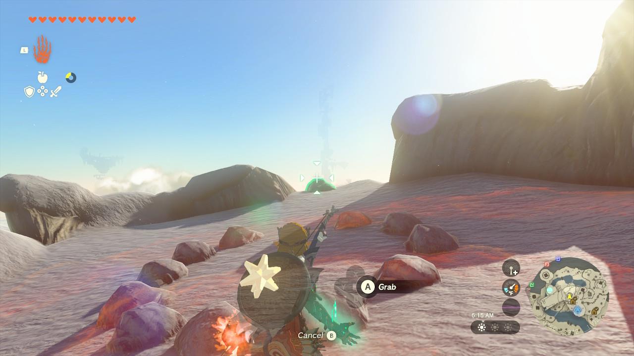 - Northeast of the Nachoyah Shrine, there’s a large, circle-shaped plateau. Head underneath it (you can follow the mine cart rails for reference) and, once at that lower ground, look for a hole that’s covered with rocks at the coordinates (0446, -1545, 1375). If you haven’t tackled the construct group nearby, it’s right next to them, up the staircase. Break the rocks (there’s a rock nearby that you can fuse to a weapon), and once down below, shoot the floating balloon on the northern end after the ledge to get the seed.