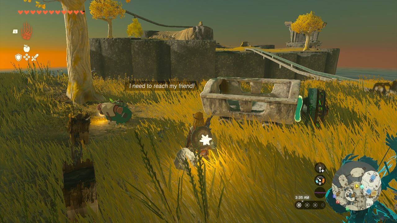 - Another Korok delivery. This one begins at a western portion of the island – if you take the large lake as reference looking at the map, follow the riverbank up north, get past the bridge, and then hop on the left side of the river before it takes a right turn. The Korok is at the coordinates (0018, -1262, 1418). In order to get the Korok to the other side, I glued two wood logs together, placed a hook on top of them, and then glued the Korok onto them. Then, place it on the rail, and it should get the Korok to the lone western island. The trip culminates at the coordinates (-0089, -1240, 1406.)