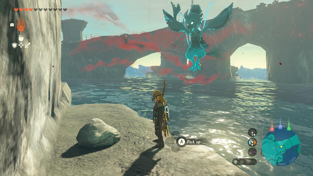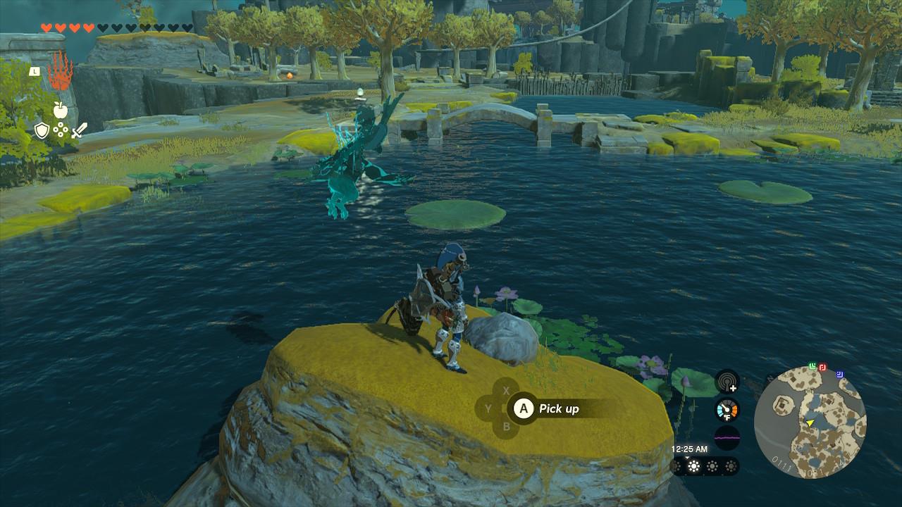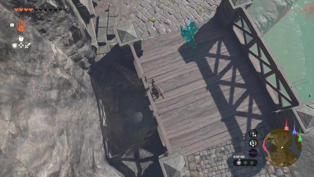 - Northeast of the First Gatehouse, you’ll see a small bridge on the map at the coordinates (-0281, 0844, 0109). There’s a rock right underneath the bridge – you can’t pick it up as it’s caged on both sides, but with the help of Ultrahand, go ahead and lift it up to uncover the Korok.