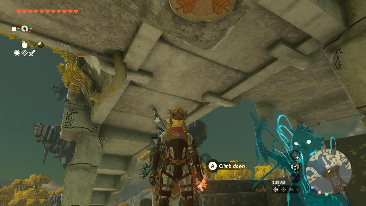 - On your way to the Temple of Time, at water level at the coordinates (0463, -0882, 1418), there’s a missing bridge pillar. If you stand on it and look up, you’ll notice Korok markings on a plate. Ascend through it.