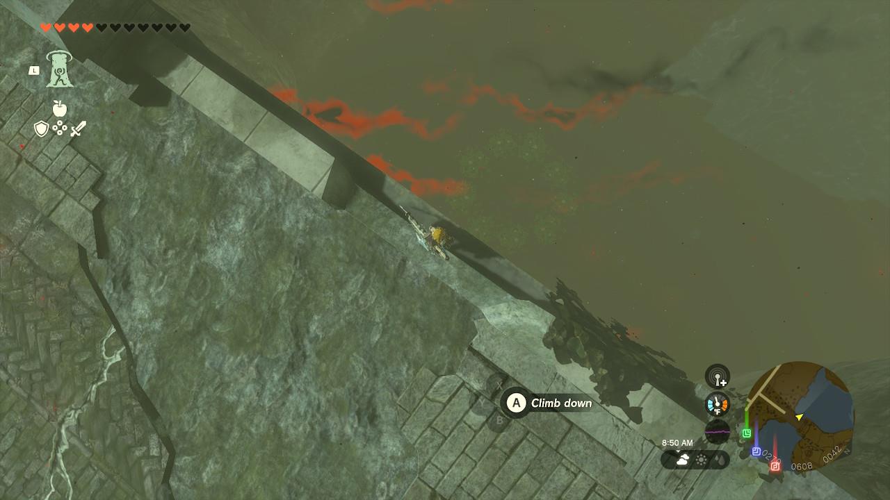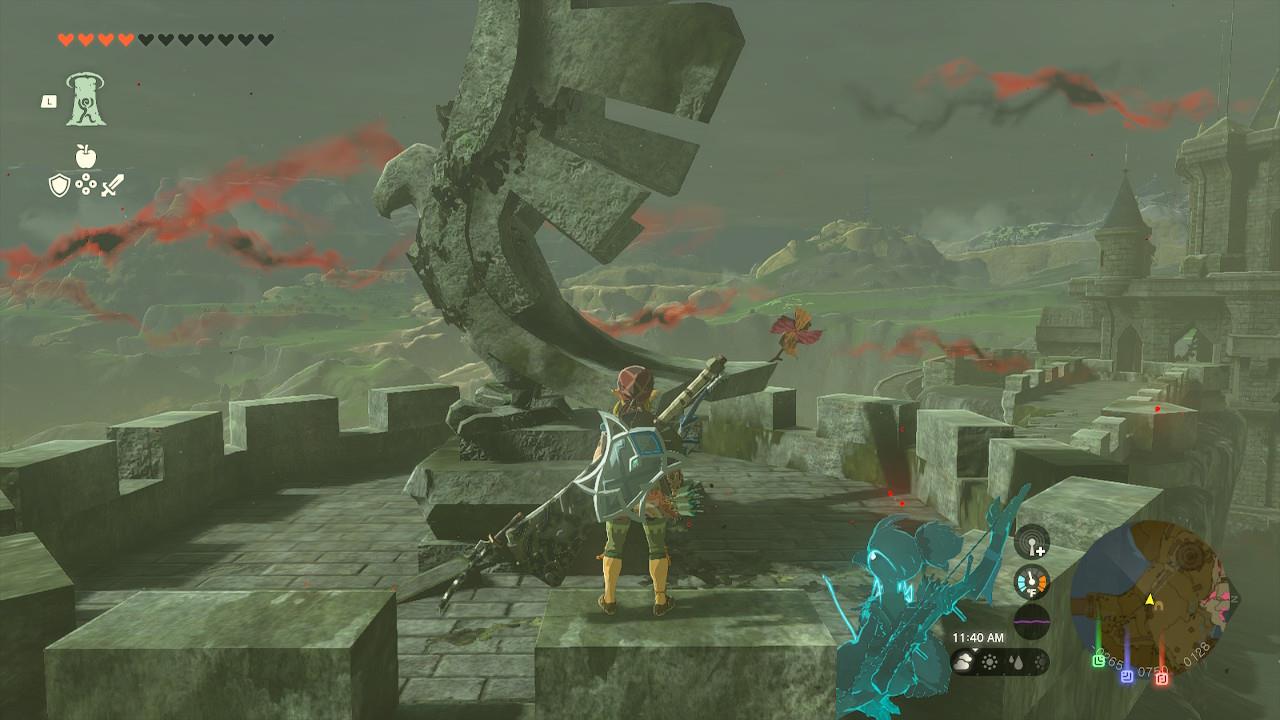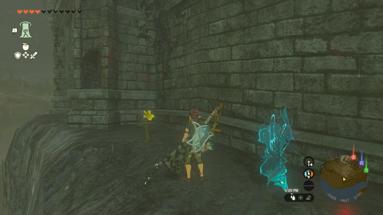 - At the first gate of the bridge, still in the Hyrule Castle Moat area, climb to the tower located east at the coordinates (-0237, 0633, 0079). The roof is broken, and lo and behold, there’s a rock to pick up and grab a seed.