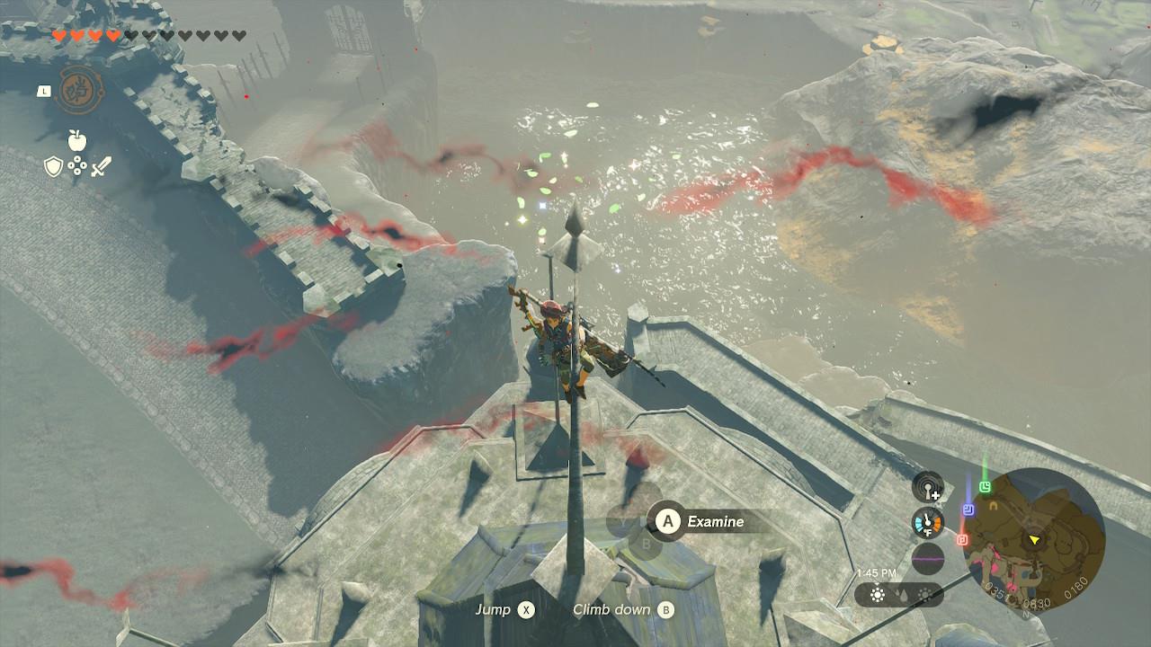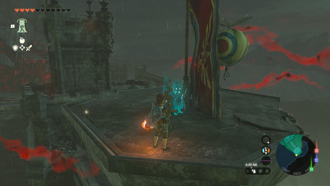 - In Hyrule Castle 1F, head to the southeastern corner of the area, following the large wall displayed on the map. At the very end, climb to the top of the tower, which has a large flag waving. At the coordinates (-0085, 0904, 0317), you’ll see a target to shoot (or just hit with a melee weapon, since it’s so close).