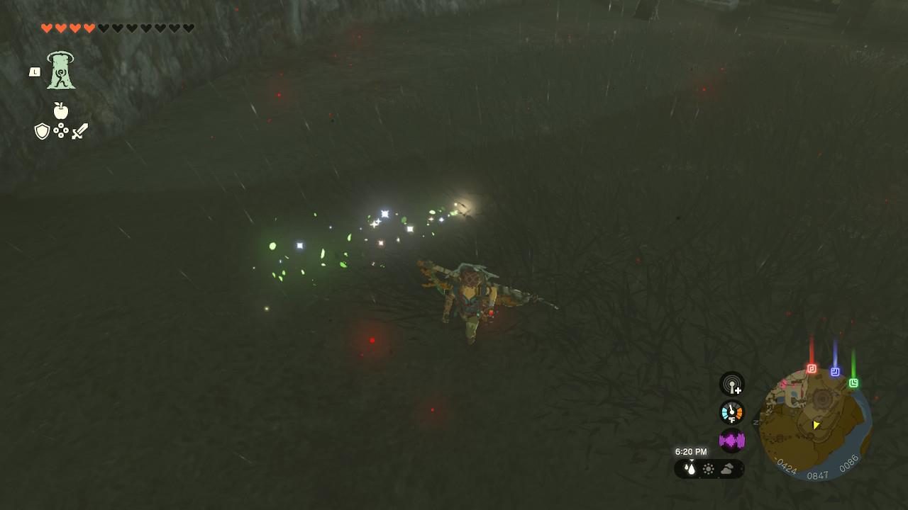 - In between the large wall that we just crossed and the First Gatehouse, there’s a circular patch of grass on a lower elevation at the coordinates (-0420, 0845, 0085). Touch the grass to reveal a moving Korok, leaving a trail of leaves. Once close, examine it to grab the seed.