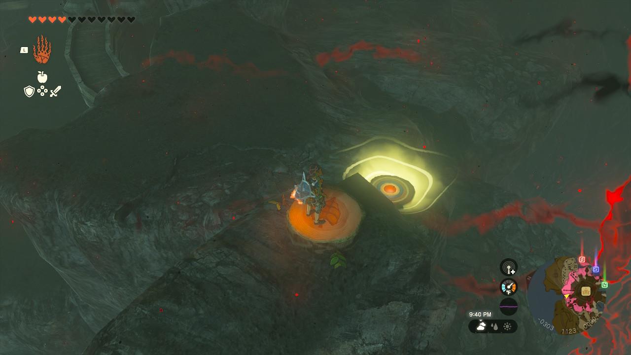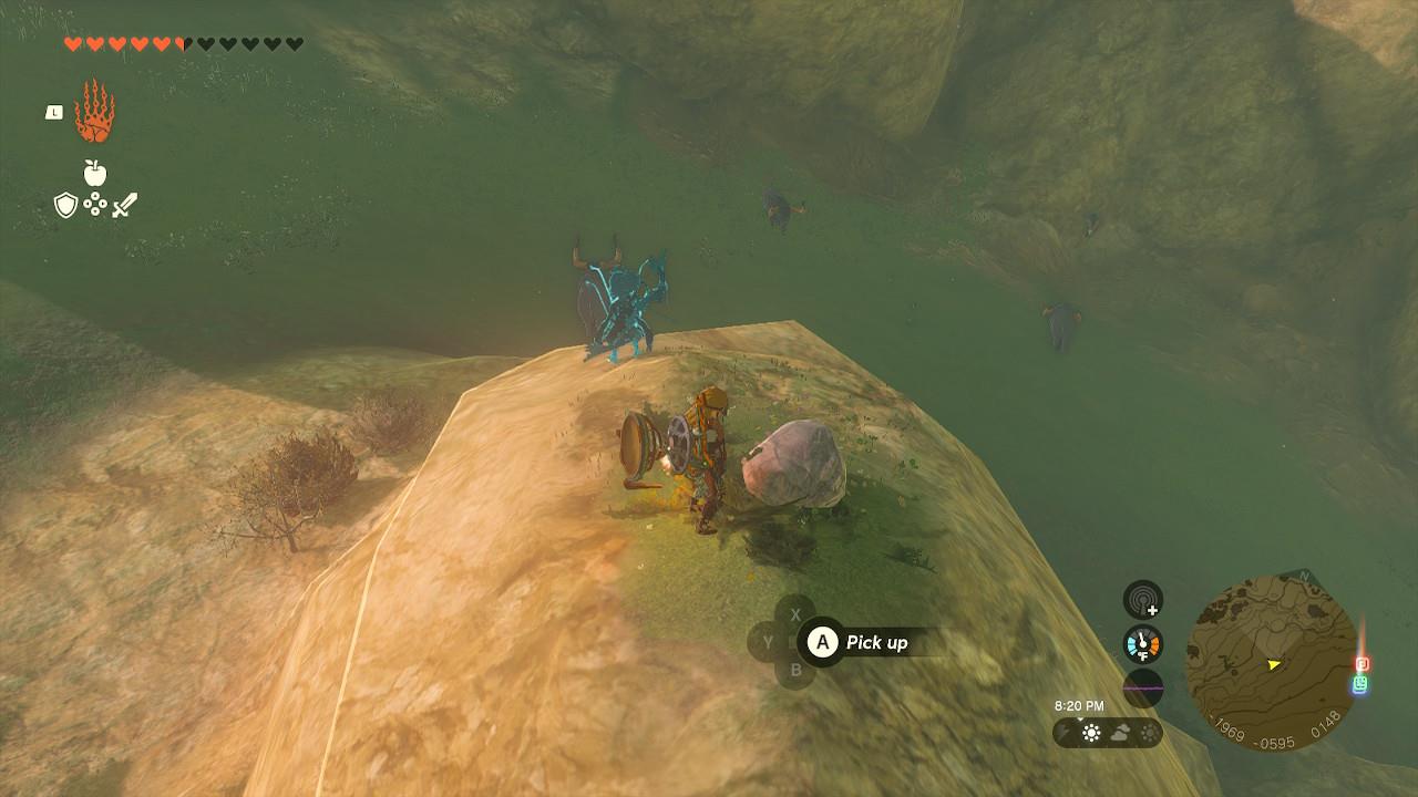 - At the top of the tree trunk northeast of the Gutanbac Shrine and the Bottomless Cave at the coordinates (0761, -1342, 1603), you’ll find a circle of rocks. There’s one missing – you can use Ultrahand to grab a rock stuck in the ground near the ledge, and place it in the vacant spot.