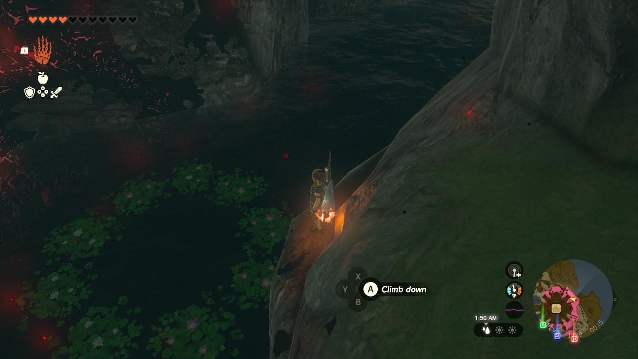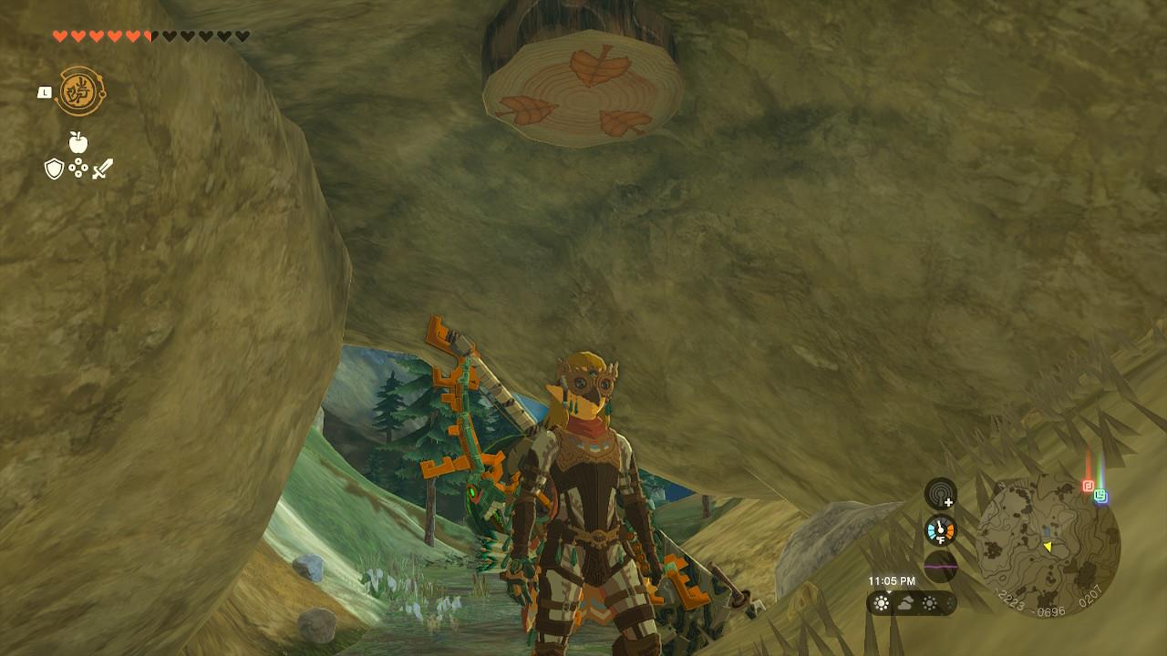 - South of the Satori Mountain itself, you’ll notice a small lake displayed on the map. Head there to find a passage that leads to a bridge of sorts. Once underneath at the coordinates (-2220, -0693, 0205), look at the ceiling to find a Korok platform. Use Ascend to go through it, obtaining the seed once you’re through the other end.