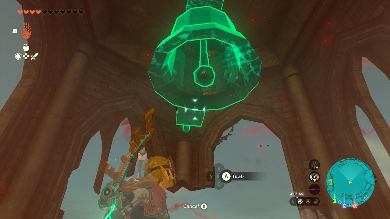 - In Hyrule Castle 1F, as you’re making your way to the top of the main tower, you’ll encounter a bell at the coordinates (-0259, 1060, 0465). Using Ultrahand, move it to the left, right, and then left to create a pendulum effect and make it ring. After a few seconds, the Korok will appear.