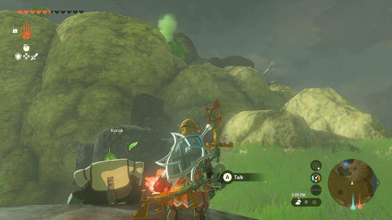 - Time for a Korok delivery. The trip begins northeast of Sonapan Shrine, at the coordinates (-1796, -0318, 0119). The Korok is down the hill, and the friend is right up the hill. There are a few platforms you can glue together with Ultrahand. I used a balloon and a flame emitter, two items I already had on me, to lift the Korok up. Then, with Ultrahand once more, I dropped the Korok at the campfire. The Korok fell off, but using Recall worked. Of course, that’s only one option, but in case it helps. You’ll then culminate at the coordinates (-1846, -0330, 0162), getting two seeds for your trouble.