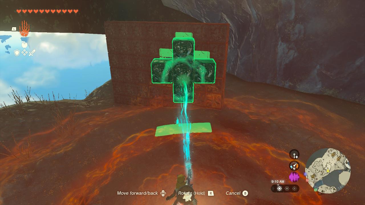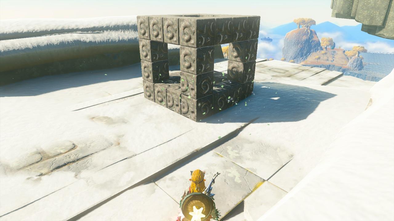 - Following the lower elevation of the southeastern section of the island, near the top of the waterfall, you’ll find a puzzle to solve at the coordinates (0626, -525, 1443), which is fairly straightforward. Just insert the plus shape into the wall with Ultrahand.