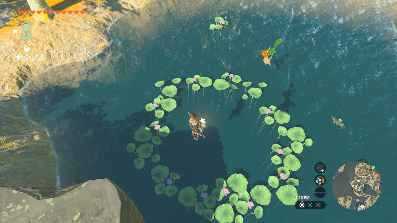 - Following the Hyrule Castle Moat that leads to the castle from the northwestern corner, you’ll find a circle of flowers on the water at the coordinates (-0292, 1130, 0015). Stand on the ledge of the inner walls and dive through the circle to get the seed.