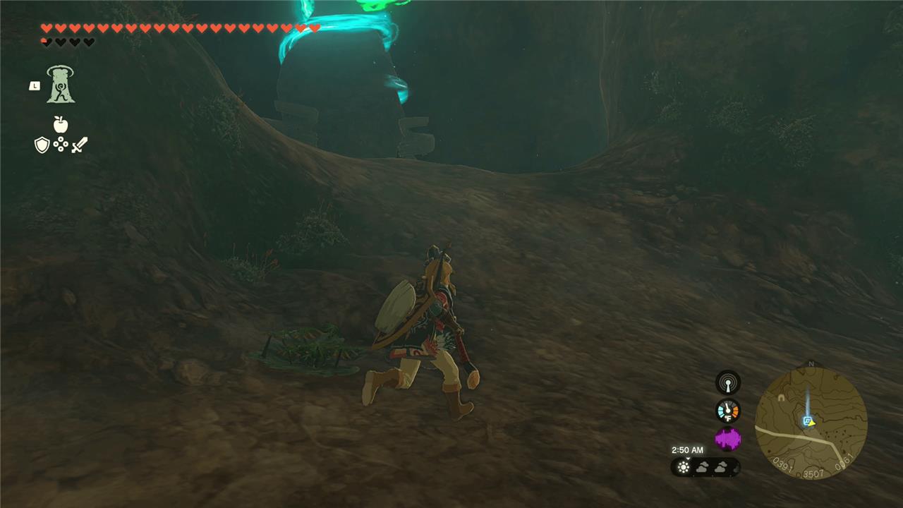 Immediately after entering the cave, Link will face a steep drop into the darkness, with a few brightbloom seeds and a lit torch gleaming in the distance. Collect these or use your own stash of brightbloom seeds to light up the area.