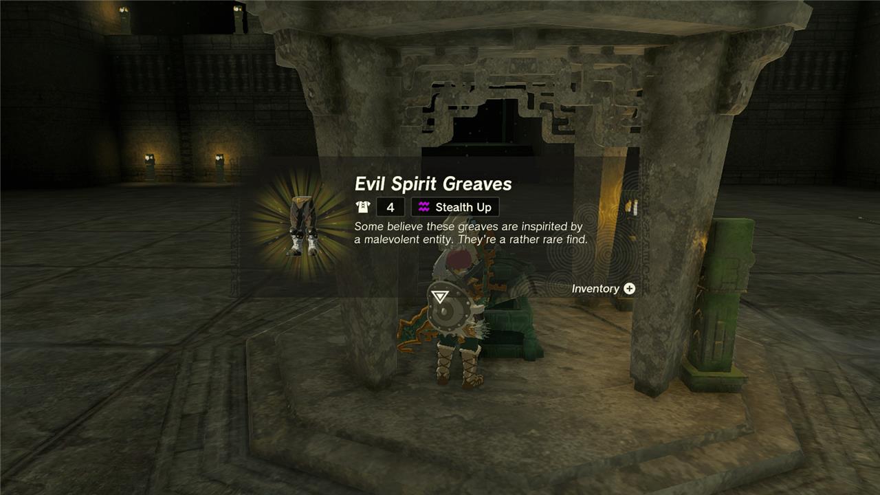Once the Construct is defeated, it’ll drop a ton of goods alongside its core. You can’t pick that core up, but you can attach it to a weapon. A chest will spawn in the middle of the room with Evil Spirit Greaves. You’ll also find several chests off each hallway in the basement; they’re full of Zonai weapons.
