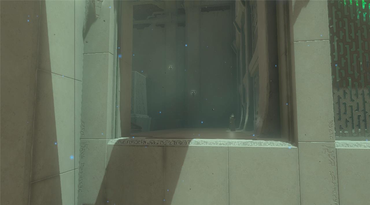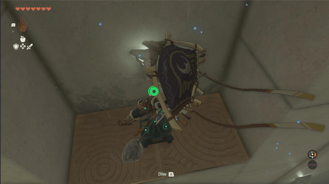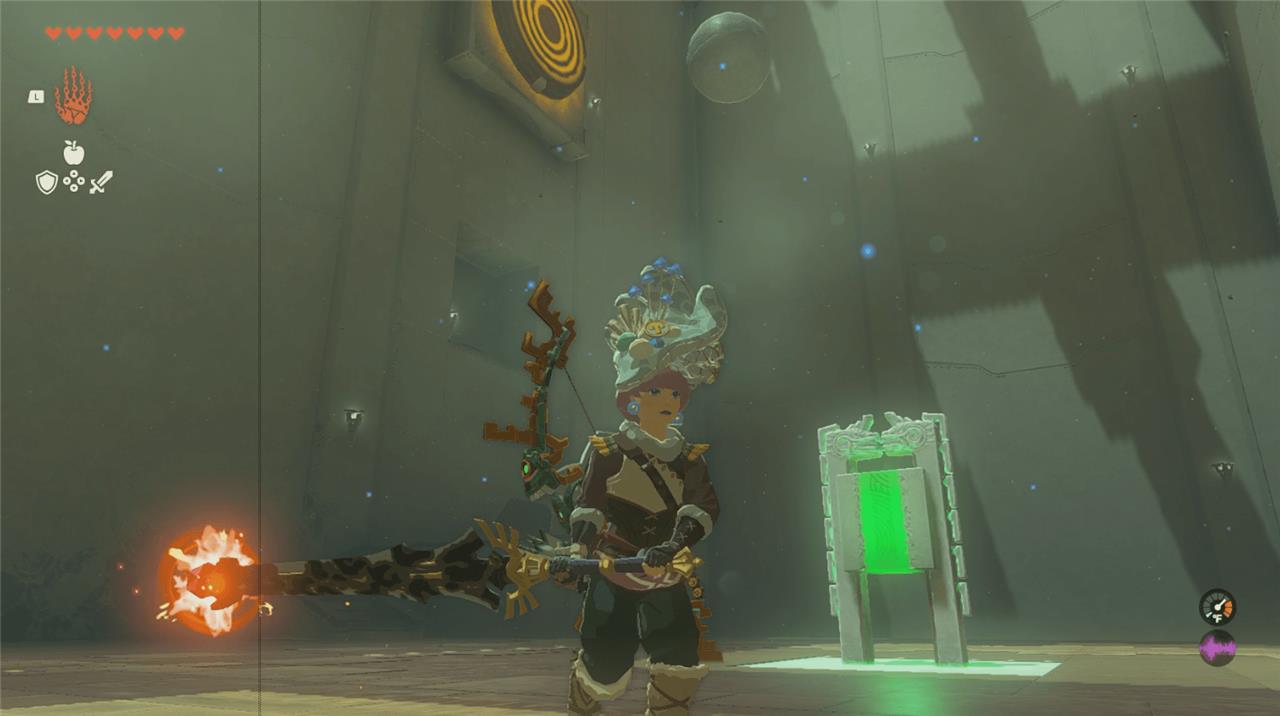 1. You’ll see a large ball being shot back and forth once you walk in, by two launchers. Between the two launchers, there’s a Zonai device. Hit it to turn it from green to yellow, which activates low gravity.