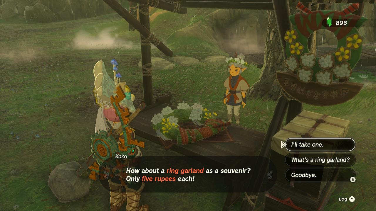 Players buy the Ring Garland from Koko’s stand in Kakariko Village. She operates between 9:00 AM and 9:00 PM, charging 5 Rupees per garland, with a one-per-day limit.โ