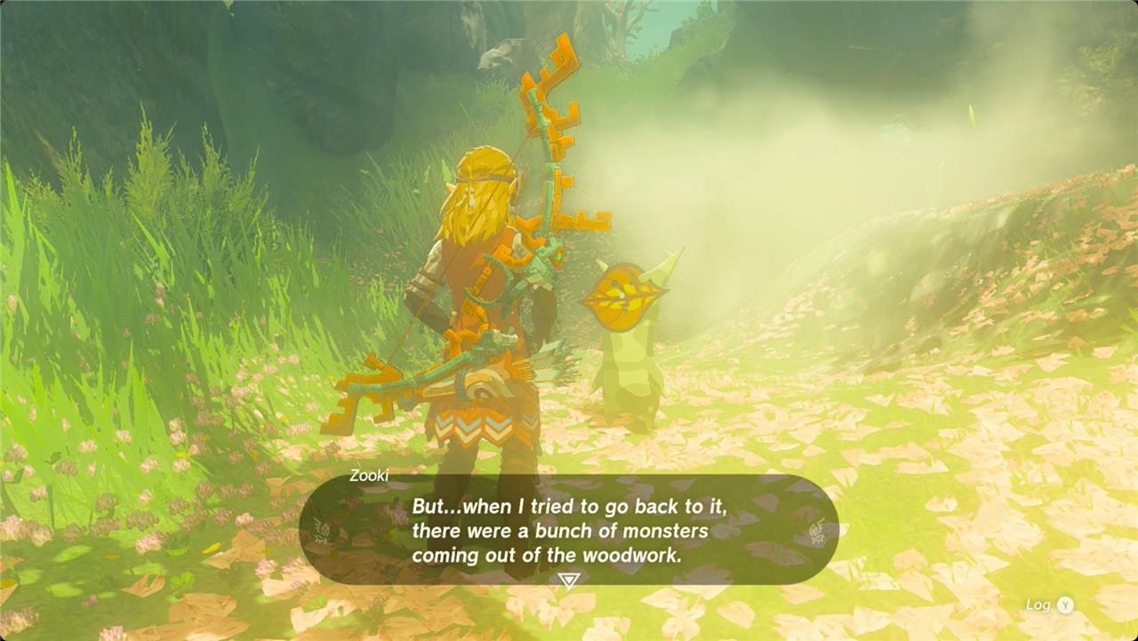 Zooki tasks Link with investigating the area since Hylians can handle dangers better than Koroks. The quest activates immediately upon dialogue, directing you to follow a trail marked by Blue Nightshade flowers through the woods while defeating enemies like Stalkoblins and Evermeans.