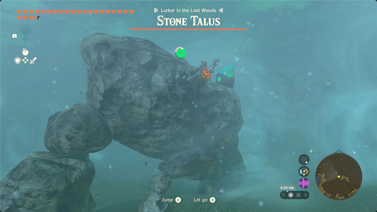 Eventually, you’ll spot the shrine crystal on top of a large boulder. When you approach it, though, you’ll notice it’s attached to a Stone Talus. Switch to a hammer-type weapon, climb up on top of its head (cephalothorax?), and target the shrine crystal.