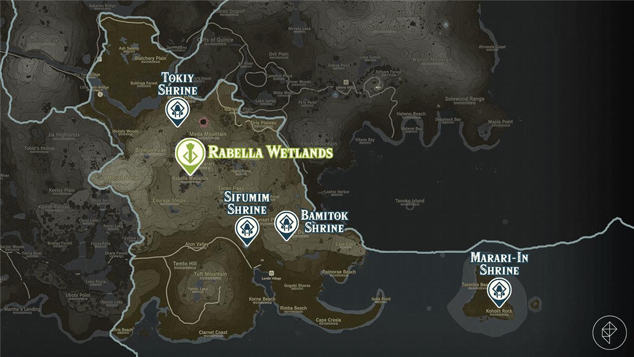 The Rabella Wetlands shrine map highlights all shrine locations scattered across the region’s marshes and surrounding highlands. Players can use this map to spot hidden sites tucked between waterways, small islands, and cliffs, making it easier to plan routes for exploration and fast travel. Each shrine offers unique puzzles and rewards that contribute to Link’s progress through Tears of the Kingdom.