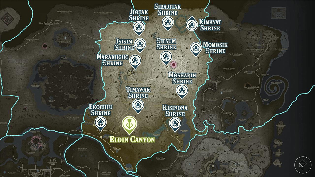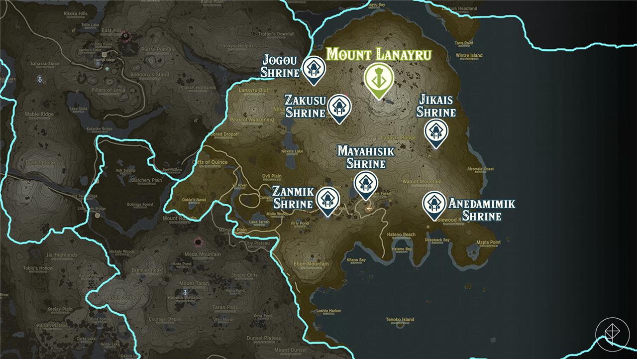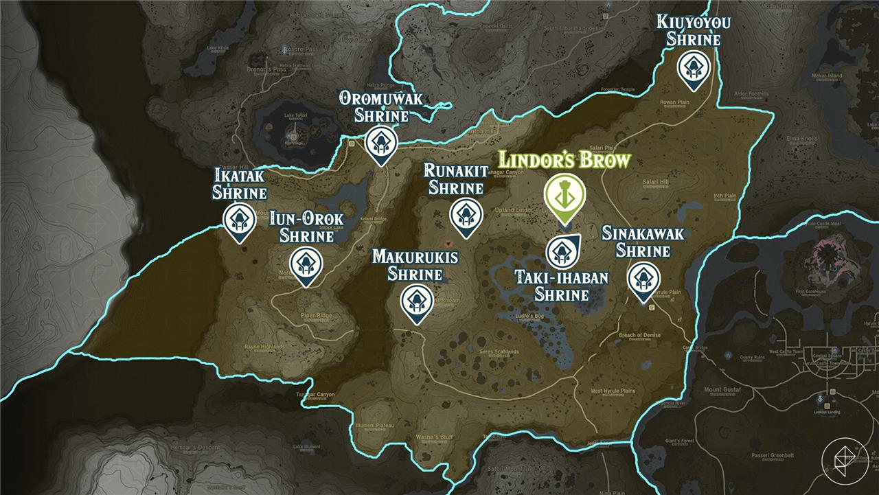 Lindor’s Brow houses several shrines scattered across steep cliffs and forested hills, making exploration both challenging and rewarding. The map highlights each shrine’s position across the region, helping players track progress and plan their routes. From vantage points on the high ridges to those hidden between valleys, each shrine contributes to completing the area’s set and expanding fast-travel options across Hyrule’s western territories.