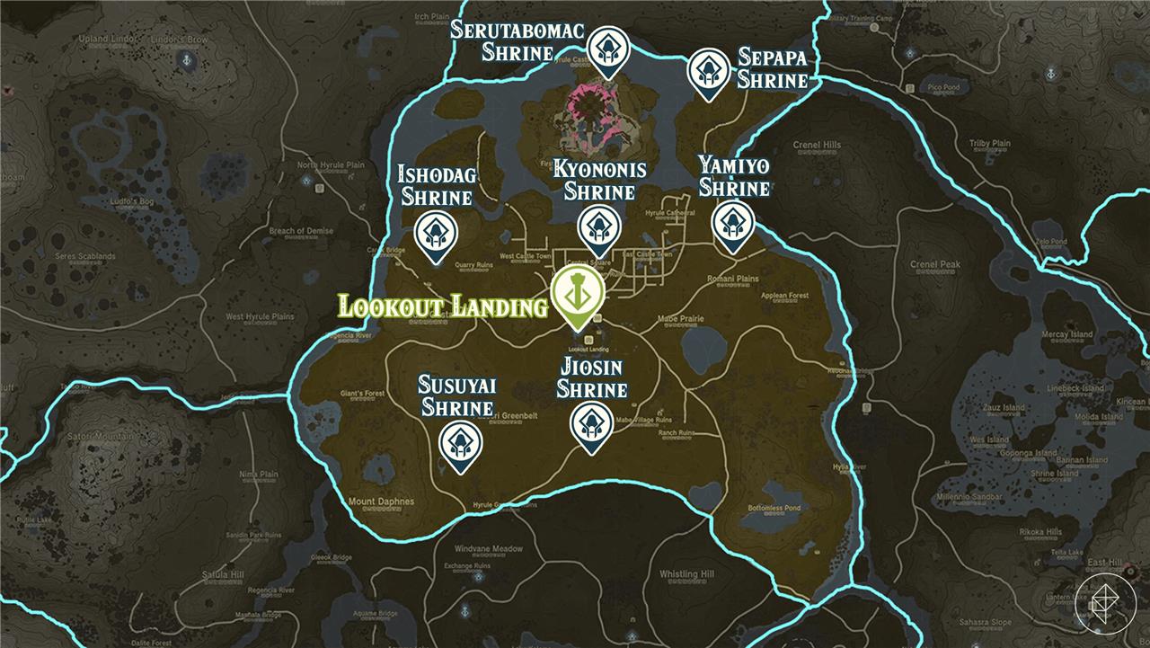 This map pinpoints all shrine locations around Lookout Landing in Zelda: Tears of the Kingdom. Use it to track down Ukouh Shrine on the Great Sky Island plateau southeast of the starting area, plus Jirutagumac Shrine beneath the landing itself and Gutanbac Shrine to the northwest on the cliffs. Additional shrines like Giant’s Grave sit south across the chasm, while Mayamats Shrine hides east amid ruins. Pin these spots to speed up your early-game quest for lightroots and blessings.