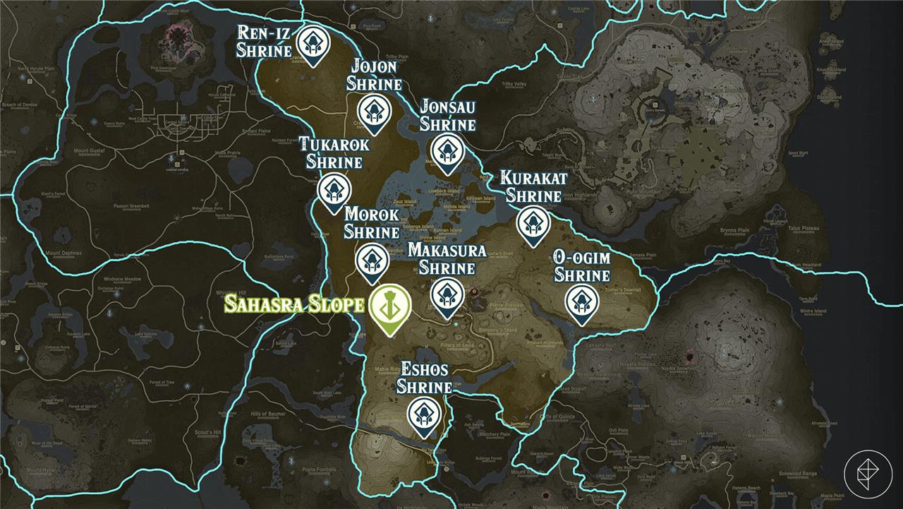 The Sahasra Slope Shrine is found in the West Necluda region, just east of Kakariko Village, hidden within a rocky hillside. Players can locate it by clearing the cave beneath the slope and removing boulders that block the entrance. The shrine contains a puzzle requiring careful use of Ascend and bomb flowers to reach the inner chamber. Marking this area on the map helps track one of the early shrines in the region and provides an easy fast travel point near Kakariko.