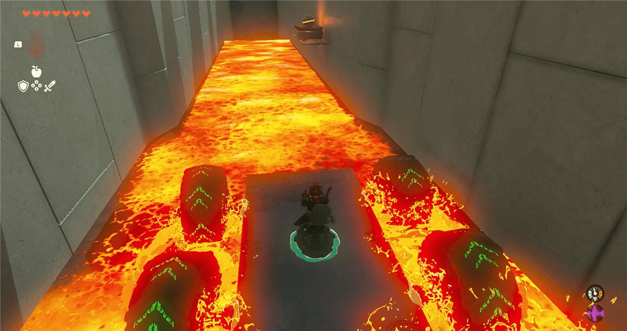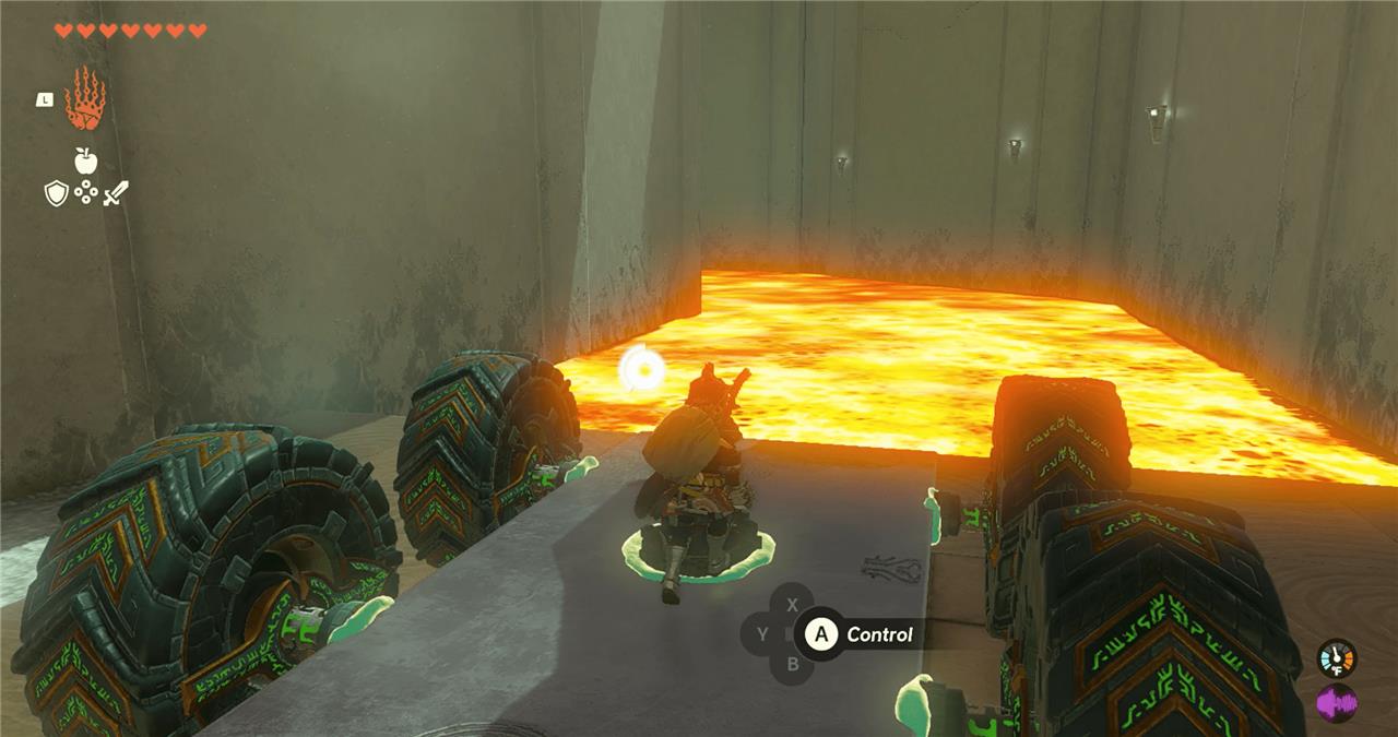 1. Straight from the shrine’s entrance there’s a simple, four-wheeled platform. (In fact, there’s a few – two to the right side.) Hop on the one waiting by the fire river. There’s a steering device that’ll kick off the ride.