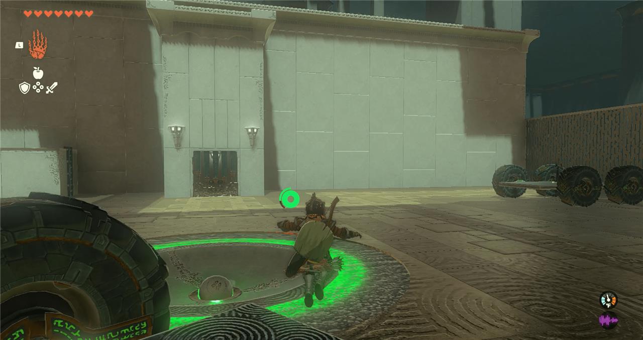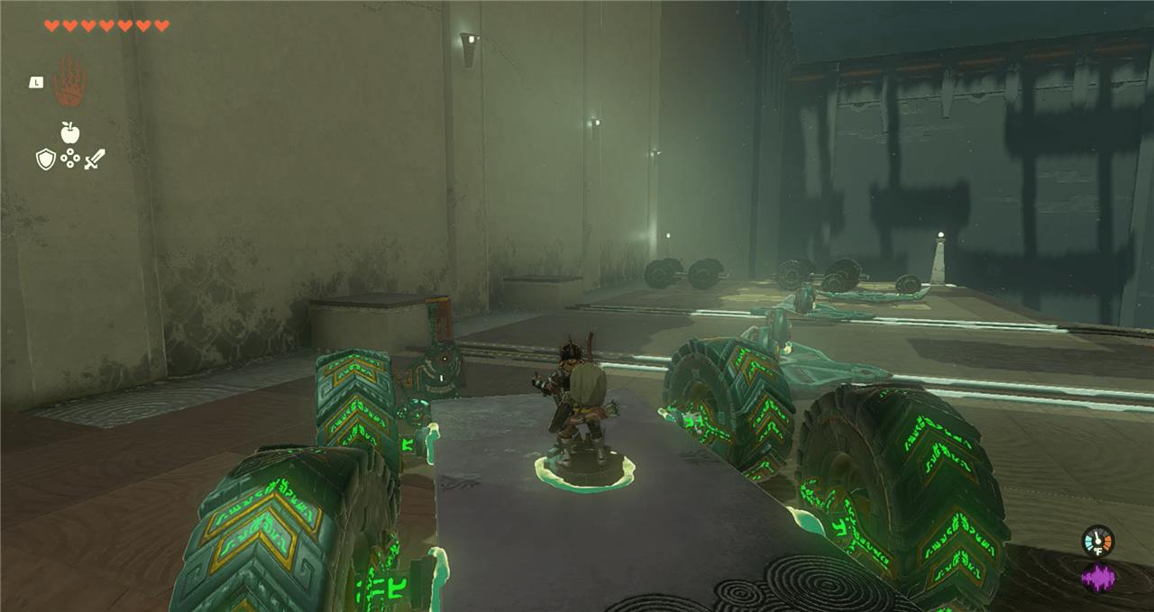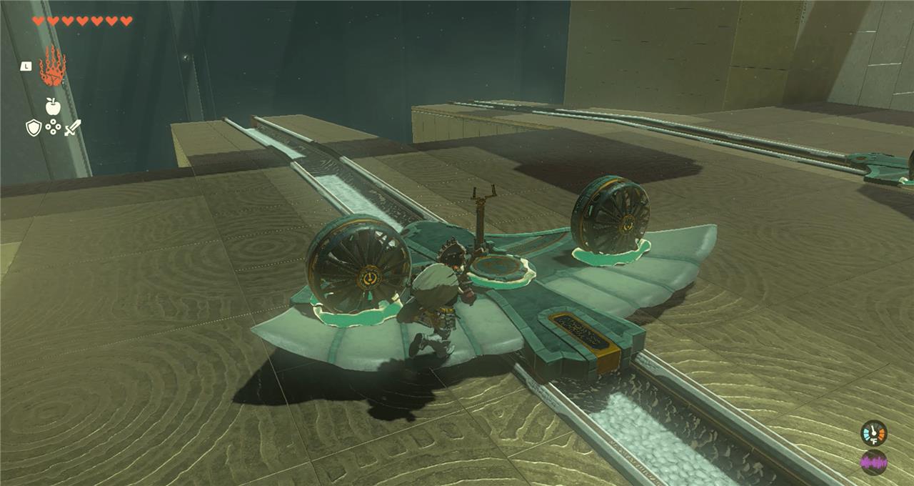 Detach a steering stick from one of the nearby carts (wiggle the right stick to free it). Attach it to the center “feet” area of a Wing glider on the rails. Stand on the Wing, activate the stick with A-the fans spin up automatically-and steer through the open chamber, dodging pillars toward the back-left altar.