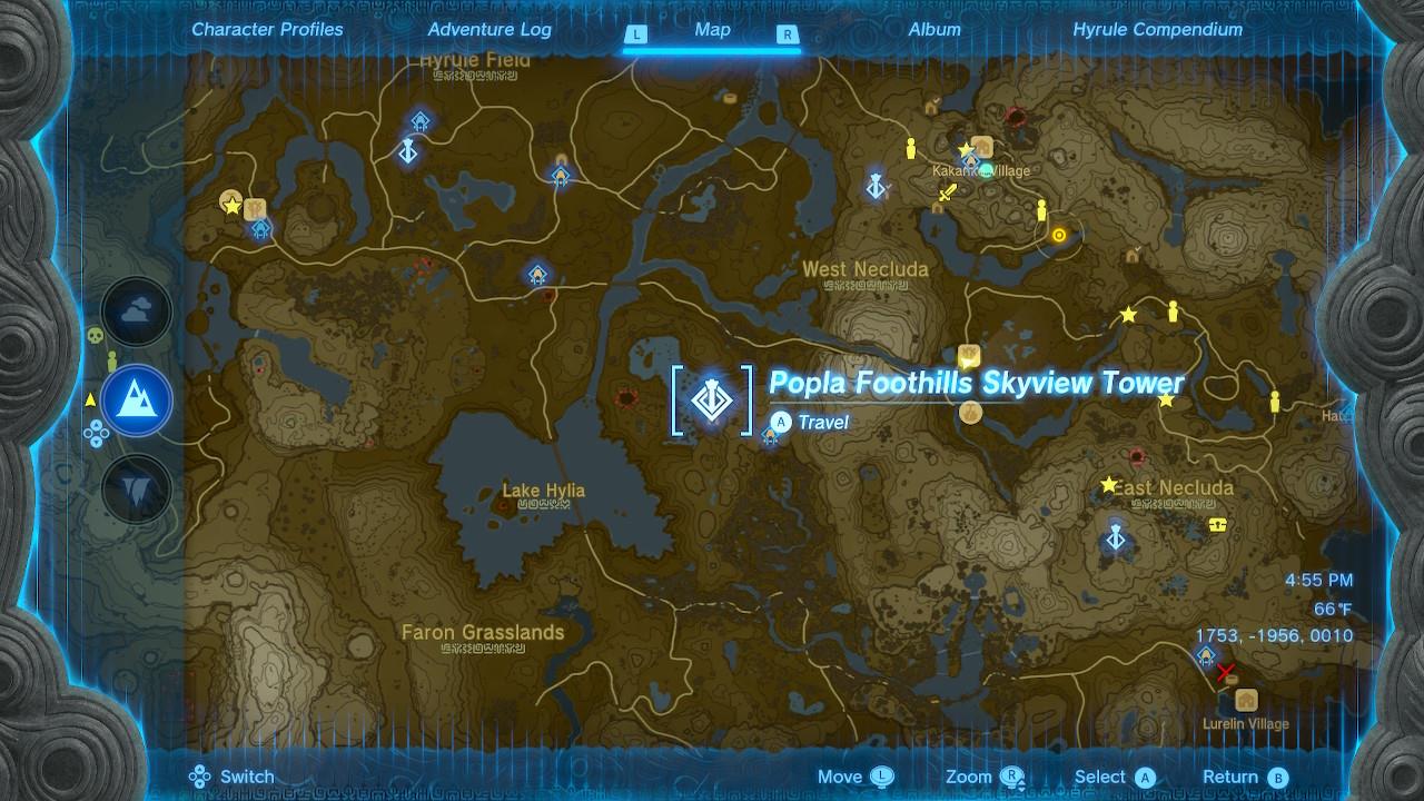 The Popla Foothills Skyview Tower is located northeast of Lake Hylia, and southwest of West Necluda.