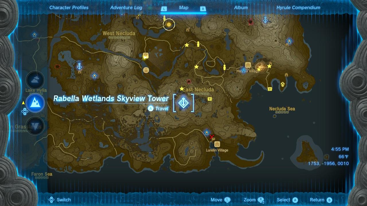 Rabella Wetlands Skyview Tower stands in the Faron region, southeast of Hyrule Field and southwest of Hateno Village. The area is often rainy, which can make climbing tricky due to slippery surfaces. Building makeshift platforms or using gear with slip resistance helps reach the top safely. Activating this tower reveals the map for the surrounding wetlands and nearby forest zones, making it a key point for exploring southern Hyrule.