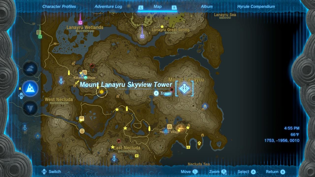 The Mount Lanayru Skyview Tower is slightly south of the location of the same name, and all the way north from the Necluda Sea and Hateno Village.