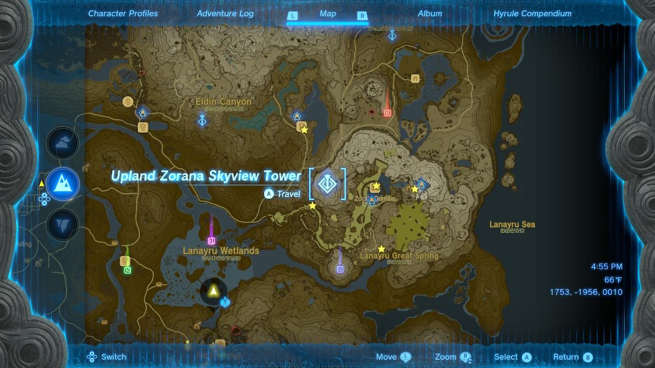 The Upland Zorana Skyview Tower is found west of the Zora’s Domain, and northeast of Lanayru Wetlands.
