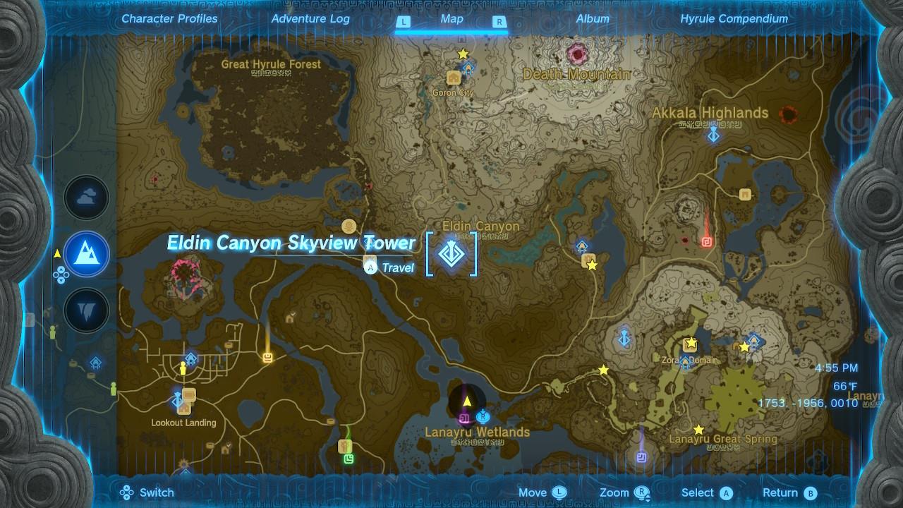 Eldin Canyon Skyview Tower stands on a rocky plateau in the volcanic Eldin region, north of Lookout Landing. The area is surrounded by lava flows and steep cliffs, so players should bring fire-resistant gear or elixirs before approaching. Once activated, the tower reveals a large section of northeastern Hyrule, including Death Mountain and the surrounding highlands, making it a valuable spot for exploring nearby caves and settlements.