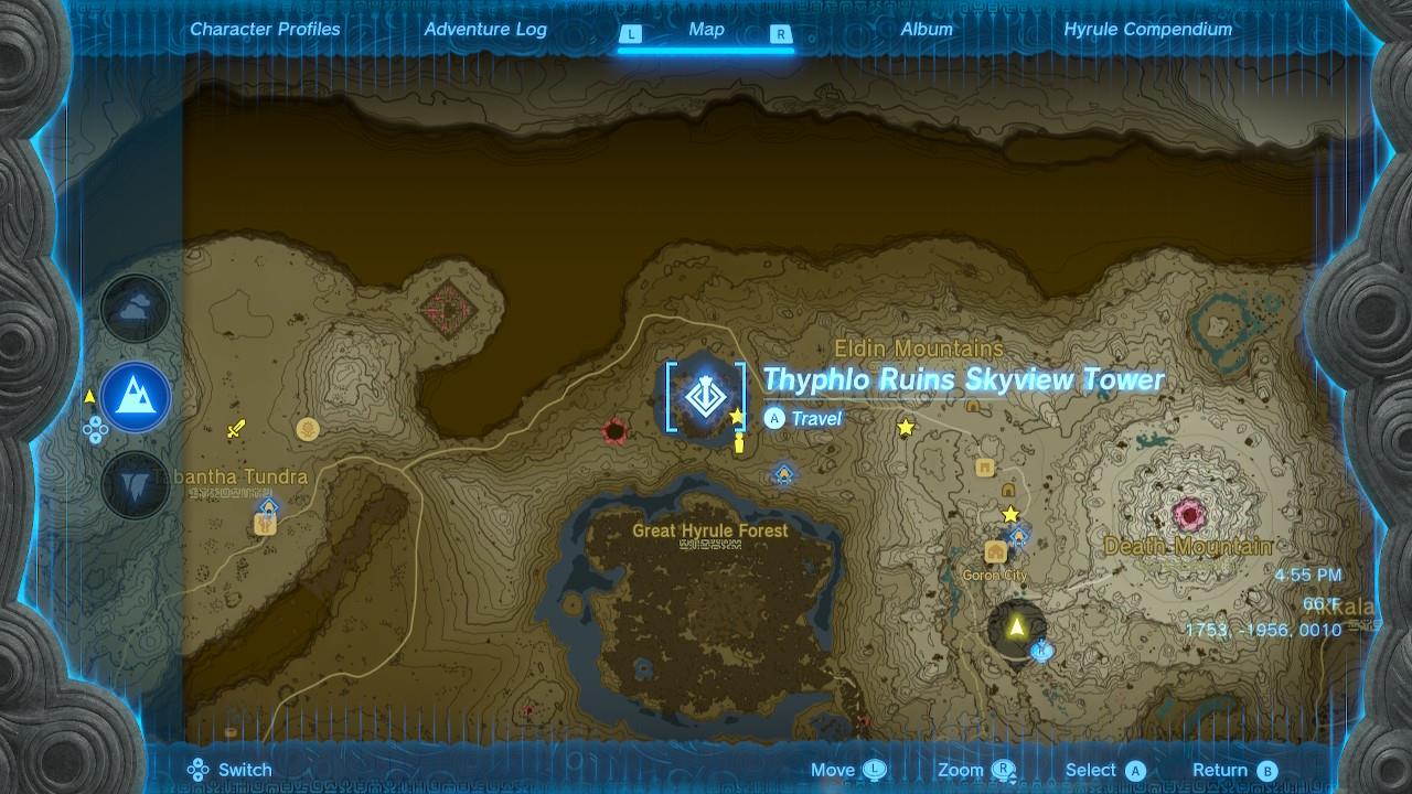 The Thyphlo Ruins Skyview Tower is located north of the Great Hyrule Forest, and west of the Eldin Mountains.