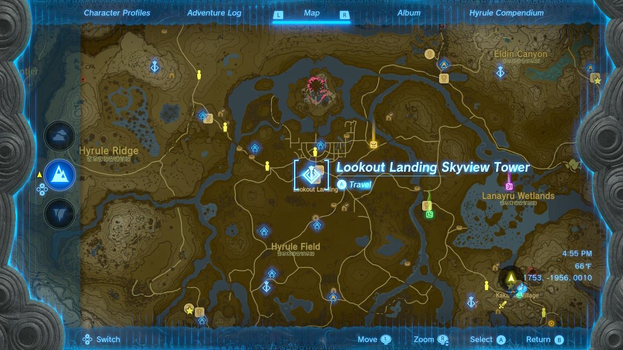 - Lookout Landing Skyview Tower (north Hyrule Field)
