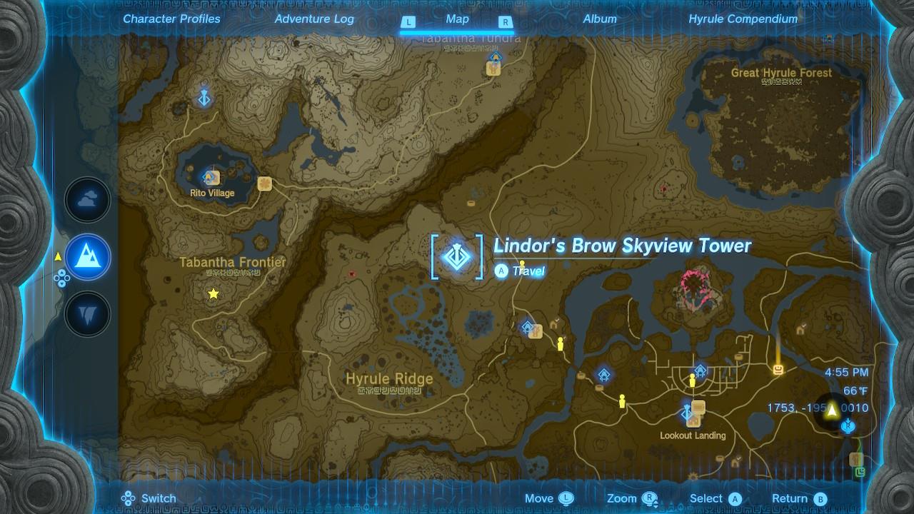 The Lindor’s Brow Skyview Tower is located northeast of Hyrule Ridge, and northwest of Lookout Landing. If you’re heading toward Rito Village on foot after your arrival to Lookout Landing, you’re likely to stumble upon it.