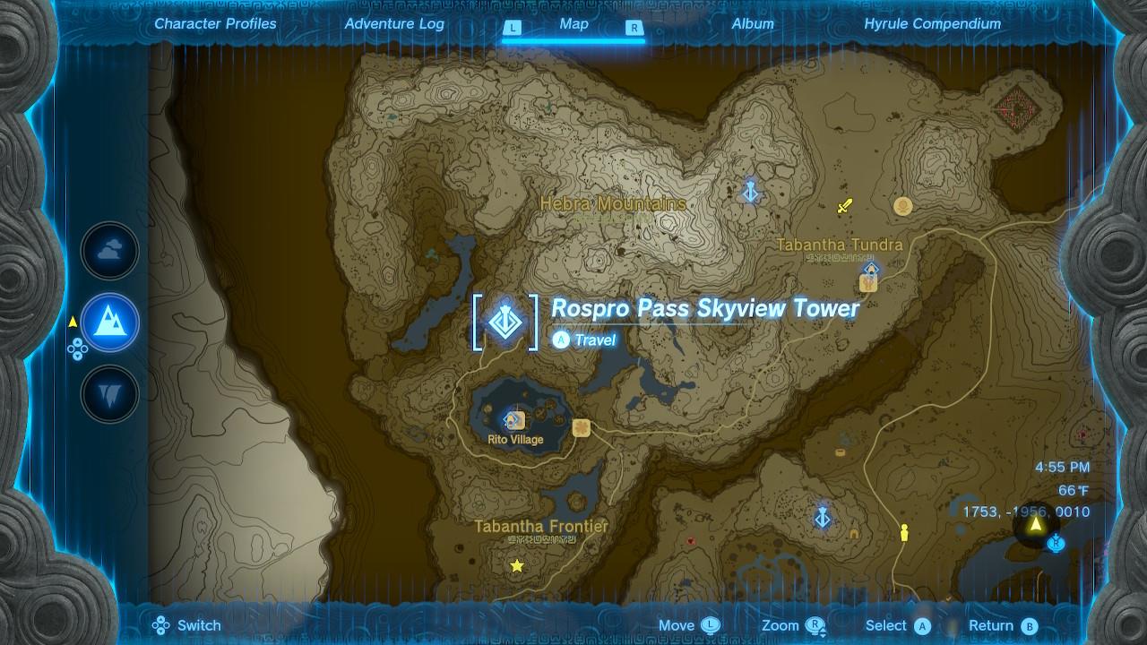 The Rospro Pass Skyview Tower can be found just north of Rito Village, and southwest of the Hebra Mountains. It’s a great fast travel point if you’re in the area, and a good way to access the village for the first time after you activate it.