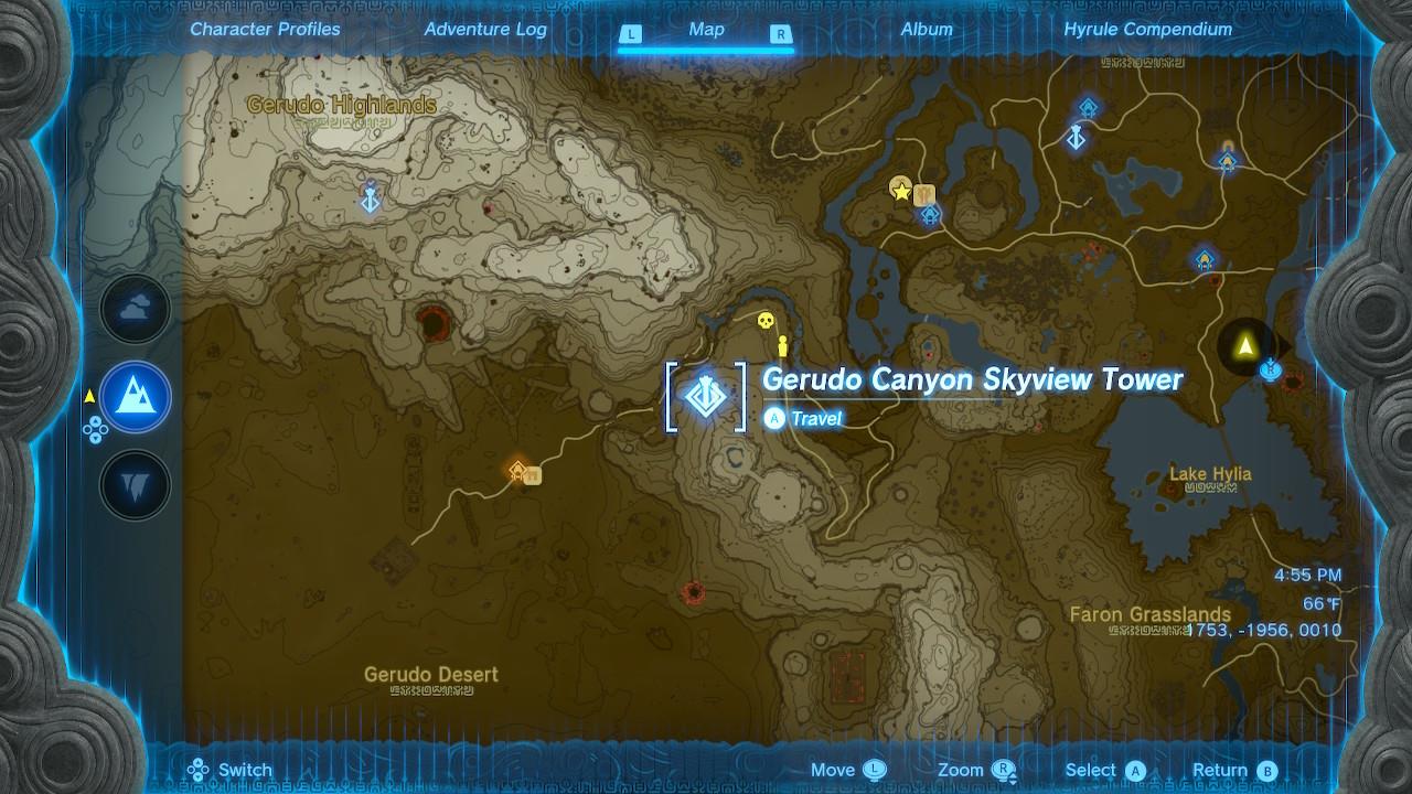 The Gerudo Canyon Skyview Tower can be found northeast of the Gerudo Desert, and northwest of the Faron Grasslands, towards the southern end of the Hyrule map.