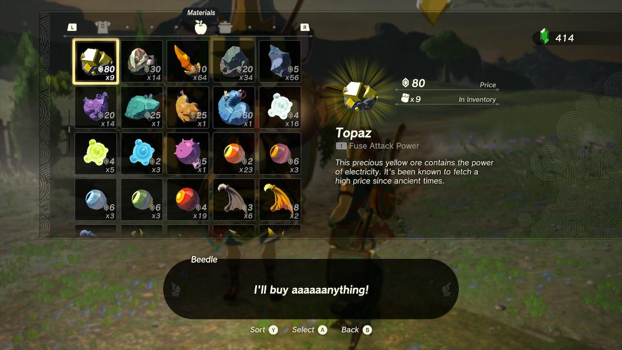 Gems like amber, opal, topaz, ruby, sapphire, and especially diamonds sell for high prices, so offloading extras from ore deposits is a fast way to build up rupees. Common materials that pile up in your inventory, such as monster parts, Zonai Charges, and duplicate armor pieces, are also safe to trade for cash, since they can usually be farmed again later. Cooked meals and elixirs made from low-value ingredients are another smart choice to sell, as their resale value is often better than the raw items, letting you clear space while boosting your wallet.โ
