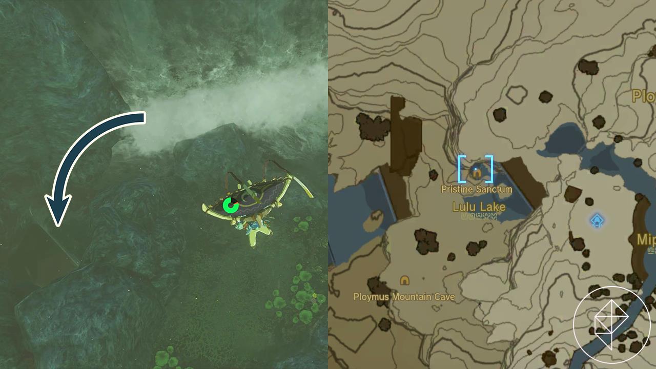 From Sidon, look up and east to spot the island with sludge pouring from its “mouth.” Equip Zora Armor to swim up the waterfall (watery bridge) flowing from it, or use Zonai devices like rockets or balloons for ascent.โ